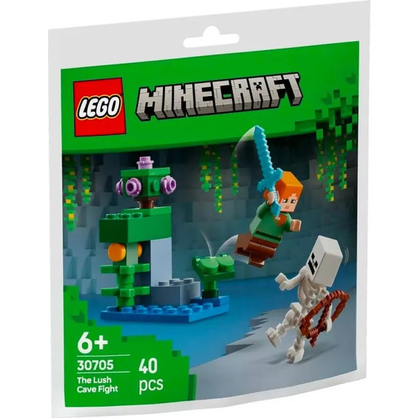 Alex utilise son épée en diamant pour combattre un squelette armé d’un arc dans une caverne luxuriante emplie d’argile, de mousse, de fleurs, de vignes, de baies lumineuses et d’une grande foliogoutte pliante.
