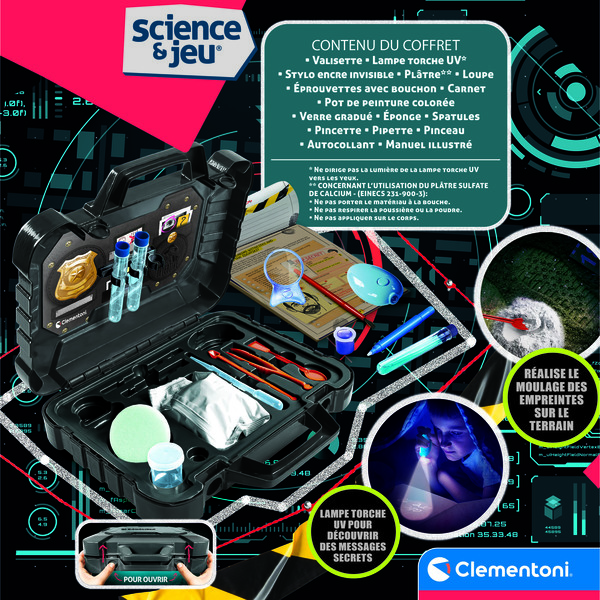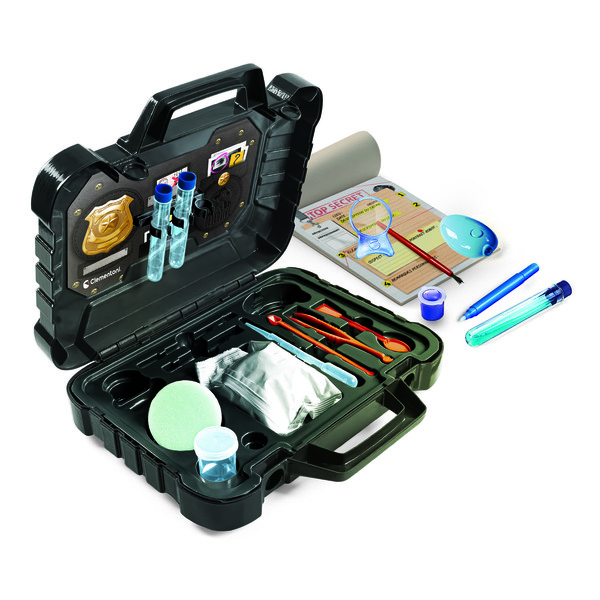Ce véritable petit laboratoire portatif contient tout le nécessaire pour mener des enquêtes à la maison : lampe UV, loupe, éprouvettes, carnet, pinceaux, plâtre et bien d’autres accessoires réalistes.